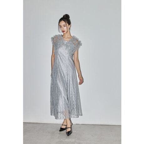 ラメ糸を使用した抽象的なレースを纏ったワンピースは、