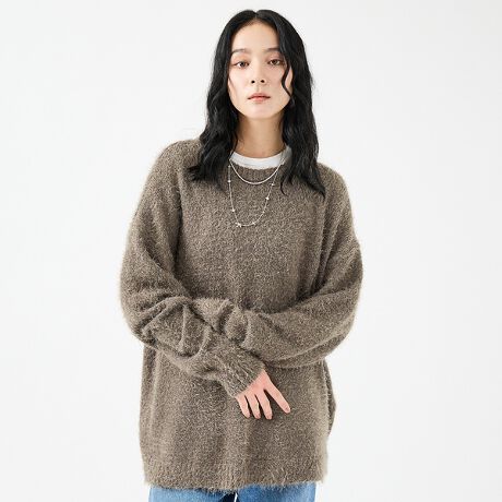 モヘアのように毛足が長く柔らかい素材感のシャギーニット素材。