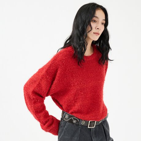 モヘアのように毛足が長く柔らかい素材感のシャギーニット素材。
