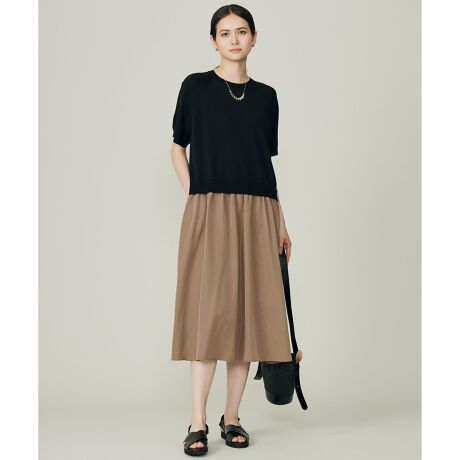 大人気の異素材コンビのドッキングワンピースが半袖で登場!■デザインニットとスカートを組み合わせたドッキングワンピースです。スタイリングに悩むことなく、1枚でさっと着るだけでサマになるデザインです。コンパクトレングスのニットが腰位置を高く見せてくれ、スタイルアップ見えが叶います。単品のスカートのようにウエストマークがないので、着心地も快適です。■素材ニット部分は、肌触りの良いセミマットなPIMA綿に合繊素材を巻いた、軽くすっきりとした質感のコットンブレンド糸を使用しております。さらりとした清涼感のある肌触りで、真夏の直前まで着て頂ける素材です。スカート部分は、さらりとした落ち感とマットな表面感が特徴のタフタ素材です。軽さがありながら高密度なタフタ織りなので、清涼感のある透けにくい素材になっております。■同シリーズアイテム7分袖ワンピース(OPW7GM0558)
