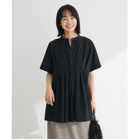 #Aライン#バンドカラーシャツ#チュニック丈#体型カバー#透け感#半袖#ヒップカバー#シャツワンピ風#夏#フレアシルエット#オフィス#レディース