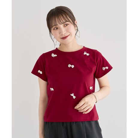 パール風ビーズの立体的なリボンが目を惹くデザインTシャツ。コンパクトなベーシックフォルムで着回しやすく、様々なテイストの着こなしに合わせていただけます。アクセントとなるボルドーを加えた色展開にも注目。短丈でトレンドのワイドボトムとも相性良く、ワードローブに加えておきたいおすすめのアイテムです。透け感[ややあり]