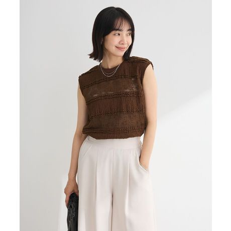 触れるたびに涼しい接触冷感素材で仕立てたノースリーブプルオーバー。横に切り替えたシアーなレース×楊柳素材に控えめなフリルをアクセントにしたフェミニンなデザインです。リブ仕様のネックラインでカジュアルな印象をプラス。シックなカラー展開でシーズナルに映えるスタイリングをお楽しみいただけます。透け感[ややあり]