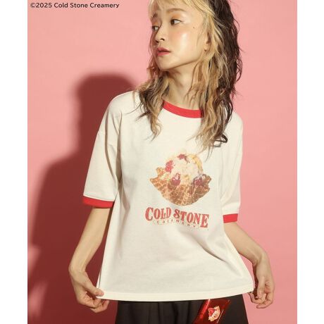COLDSTONEとのコラボレーションアイテムにTシャツが登場。大きなワッフルアイスのプリントがPOPな雰囲気溢れるひと品です。リラクシーなベーシックシルエットに衿と袖口の配色パイピングが魅力のポイント。一枚さらっと着るだけでスタイリングにインパクトを加えてくれるおすすめの差しアイテムです。透け感[ややあり]