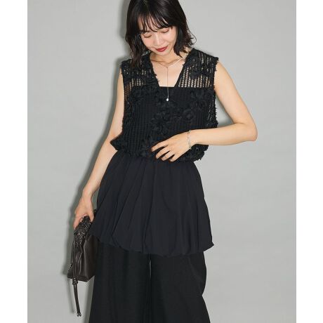 フラワーモチーフの立体的なテープ刺繍が華やかなレースベスト。トレンドのメッシュ素材で仕立て、インナーとのカラーコントラストもお楽しみ頂けます。腰回りをカバーしてくれる長めの着丈で、自然とスタイルアップを後押し。まだ暑い時期にはメイントップとして、涼しくなってきたらレイヤードスタイルにも活躍するおすすめのアイテムです。透け感[ややあり]