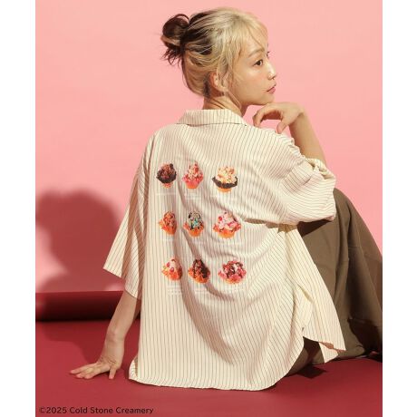 COLDSTONEとのコラボレーションアイテムの開襟シャツ。胸元にはスクリプトロゴ刺繍でワンポイントを加えました。ワッフルアイスを並べたメニュー風のバックプリントが遊び心溢れるデザイン。USカジュアルテイストなストライプ柄がカジュアルに着映えを叶えてくれるおすすめのトップスです。透け感[ややあり]