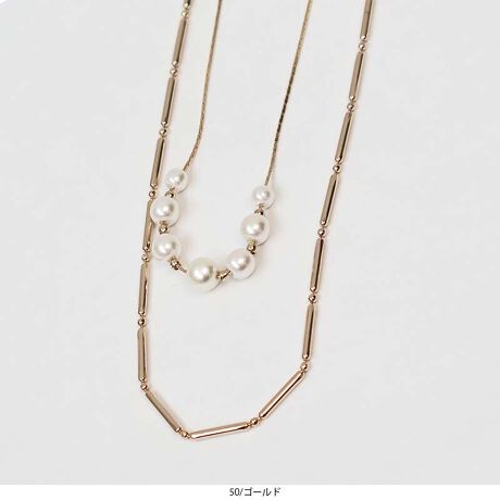 長めのチェーンと短めのパール使いネックレスは、それぞれ単品でも使える2WAY仕様。