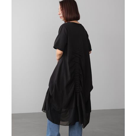 ストライプと裾周りのデザインが映えるレイヤードチュニック。裾にはシアーの別布がドッキングされていたり、タックやギャザーでデザイン変化があるので、一癖あるデザインとなっています。