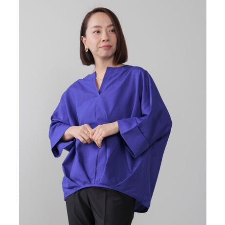 上品なリラックス感ときちんと見え、そのどちらも叶えてくれる一枚です。麻のようなほどよいハリがあり、さらりとした見た目で季節を問わず活躍。体にまとわりつかないシルエットなので、忙しい朝でも迷わずサッと着られます。首元はキーネックで顔まわりをすっきり。裾のタックが腰回りを自然にカバーし、インしなくてもバランス良く着こなせます。ゆるさの中にきちんと感もあり、パンツにもスカートにも合わせやすいのも魅力的。オンにもオフにも頼れる、大人のワードローブにぴったりのブラウスです。