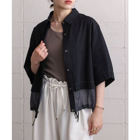 身頃を上下で切り替えて裾にコードを通したスポーティ寄りなディテールのデニムシャツです。裾のブラウジング具合によっては結構ショート丈になり、羽織でもアレンジが効いたスタイリングになるアイテムです。ブラウジングできる裾身頃のみふくらみとシアー感が生きるシアーデニムを使用しています。 製品後ワンウォッシュ仕上げ。