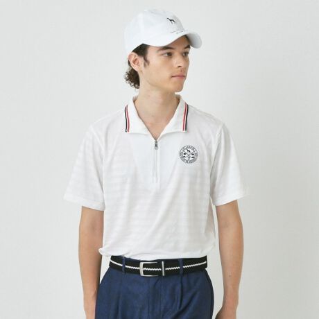 同色ボーダーを織で表現した半袖のハーフジップTは、洗練されたデザインが光る一着です。