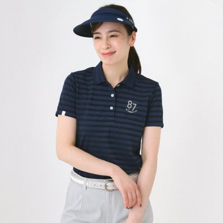 【シャドーボーダー素材の胸元にラインストーンロゴが輝く定番ポロシャツ】