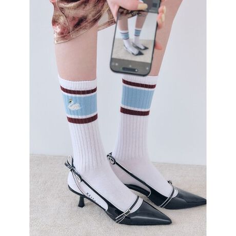 やや太めに設定したリブ目が、ほどよくストリートなムードを演出するリブソックス。締めつけすぎず、ずり落ちにくい快適なフィット感にもこだわりました。今回のコラボのために描き下ろされたヒョウと、KEITA MARUYAMAアーカイブから抜き出したスワンモチーフを、ワンポイント刺繍でそれぞれデザイン。モチーフに合わせてラインの配色も調整し、カジュアルになりすぎない大人な仕上がりに。
