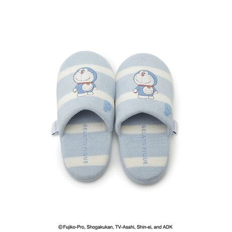 幅広い世代の人気キャラクター『ドラえもん』の世界観を、ジェラート ピケの優しいルームウェアで表現した、楽しさと心地良さがいっぱいのコレクションが登場しました。ジェラート ピケらしい淡いボーダーのジャガードに、ドラえもんのワッペン刺繍をあしらったHOMMEサイズのルームシューズ。軽やかな’エアリーモコ’を使用した、ふんわり包まれるようなはき心地です。色は立ち姿ポーズのブルー、座り姿ポーズのチャコールグレーの2色展開。同シリーズのルームウェアと合わせたり、LADIES’サイズとのペアコーディネートもお楽しみいただけます。