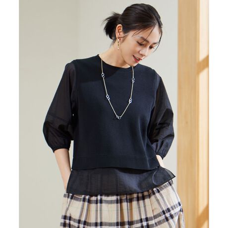 ふんわりした袖とシアー素材のコンビが華やかなニット■デザイントレンドのシアー素材とコンビのデザインプルオーバーニットです。ふんわりと膨らむランタンスリーブが華やかな印象です。暑い時期に1着でサマになるように、レイヤード風に仕上げているのがポイントです。■素材ニットは、肌触りの良いセミマットなPIMA綿に合繊素材を巻いた、軽くすっきりとした質感のコットンブレンド糸を使用しています。さらりとした肌触りで真夏の直前まで着て頂ける素材です。部分使いのシアー素材は、適度なハリ感とナチュラルな表情が特徴のエレガンスな印象の素材です。■同素材アイテムワンピース(OPWMGA0251)