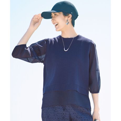 ふんわりした袖とシアー素材のコンビが華やかなニット■デザイントレンドのシアー素材とコンビのデザインプルオーバーニットです。ふんわりと膨らむランタンスリーブが華やかな印象です。暑い時期に1着でサマになるように、レイヤード風に仕上げているのがポイントです。■素材ニットは、肌触りの良いセミマットなPIMA綿に合繊素材を巻いた、軽くすっきりとした質感のコットンブレンド糸を使用しています。さらりとした肌触りで真夏の直前まで着て頂ける素材です。部分使いのシアー素材は、適度なハリ感とナチュラルな表情が特徴のエレガンスな印象の素材です。■同素材アイテムワンピース(OPWRGA0251)