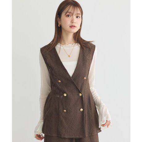 繊細なレースが目を惹くエレガントなジレ。トラッドライクなダブルボタンに、ウエストから広がるAラインシルエットで女性らしく仕上げました。セミマットな金釦がスタイリングに上品なアクセントをプラス。薄手で羽織りやすくスイッチシーズンにぴったりな一着です。同素材で仕立てたイージーパンツと合わせたセットアップの着用もおすすめ。