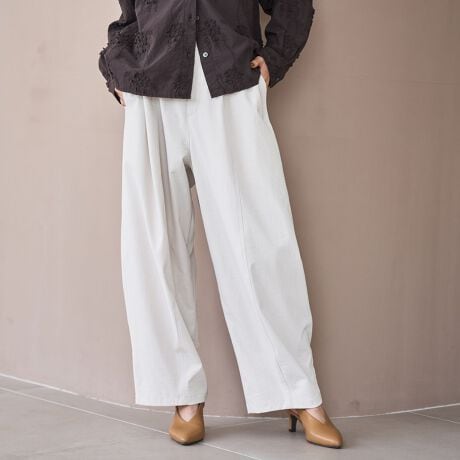 ウエストはゴム仕様でラクな穿き心地ながら、上品な表情できれいめコーデにも◎
