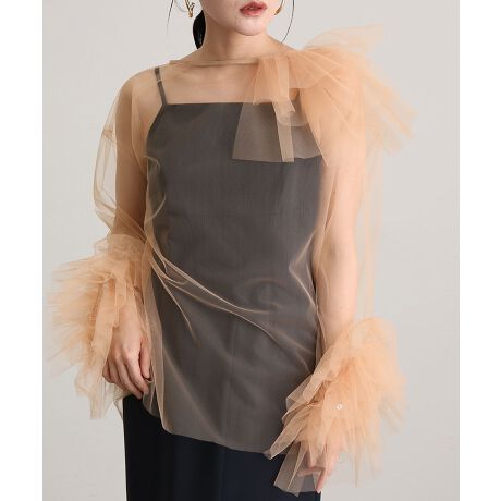 立体感とエアリーさを絶妙に両立させた、チュールフリルトップスとキャミワンピースのセットアイテム。