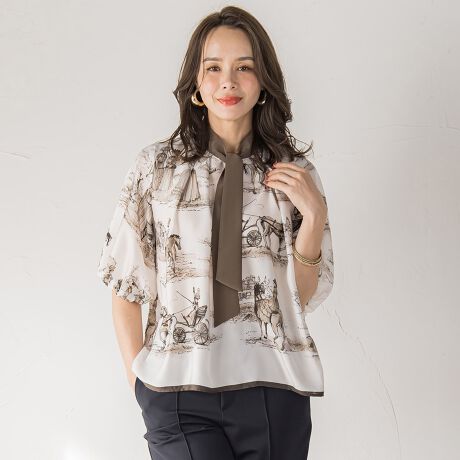 繊細に書き込まれた貴婦人と風景画が美しいボウタイブラウス。