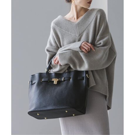 ゴールドの金具とベルト使いがアクセントになったトートバッグ。