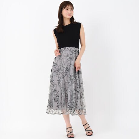 トップスはリブニット、スカート部分は繊細なレース素材で切り替えた、1枚で華やかに決まるドッキングワンピース。