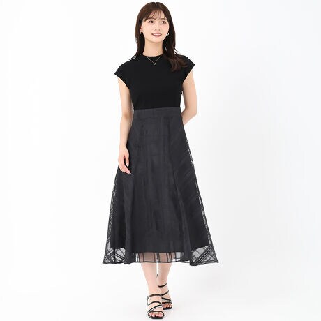 シアーチェックスカートが華やかに揺れる、異素材ドッキングワンピース