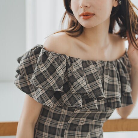 ふんわり重ねたフリルデザインが可愛らしいチェックブラウス。ネックラインにはギャザーを施し、そのままでもオフショルダーとしても着用することができます。ボディラインに沿うようなすっきりとしたシルエットもポイント。同素材のスカートとセットアップで着用するのもおすすめです。■fabric透け感[無し]裏地[無し]伸縮性[やや有り]生地の厚さ[普通]