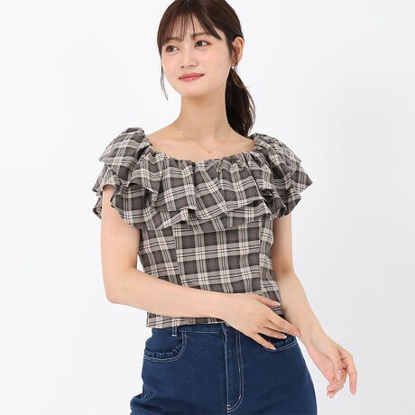ふんわり重ねたフリルデザインが可愛らしいチェックブラウス。ネックラインにはギャザーを施し、そのままでもオフショルダーとしても着用することができます。ボディラインに沿うようなすっきりとしたシルエットもポイント。同素材のスカートとセットアップで着用するのもおすすめです。■fabric透け感[無し]裏地[無し]伸縮性[やや有り]生地の厚さ[普通]