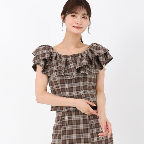 ふんわり重ねたフリルデザインが可愛らしいチェックブラウス。ネックラインにはギャザーを施し、そのままでもオフショルダーとしても着用することができます。ボディラインに沿うようなすっきりとしたシルエットもポイント。同素材のスカートとセットアップで着用するのもおすすめです。■fabric透け感[無し]裏地[無し]伸縮性[やや有り]生地の厚さ[普通]