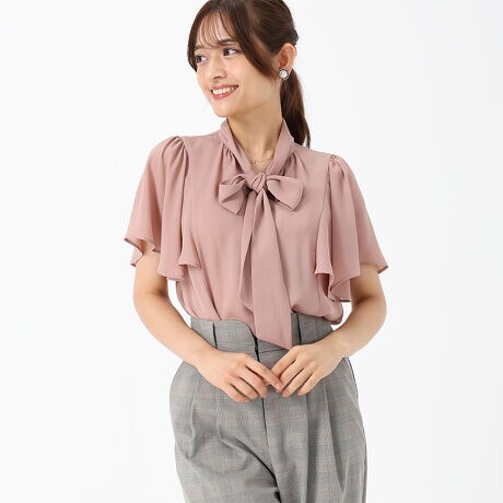 首元のボウタイが女性らしさをプラスするブラウス。袖口が広がるケープ風のデザインになっており、軽やかな印象を与えます。シボ感のある楊柳素材が魅力的。ボトムスにタックインしたコーディネートがおすすめです。■fabric透け感[有り]裏地[無し]伸縮性[やや有り]生地の厚さ[薄手]