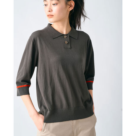 ポロ衿デザインがポイントの7分袖。ハイツイストの素材と16ゲージの仕様で薄く肌離れが良いため、ニットのプルオーバーでも涼しく着用可能。