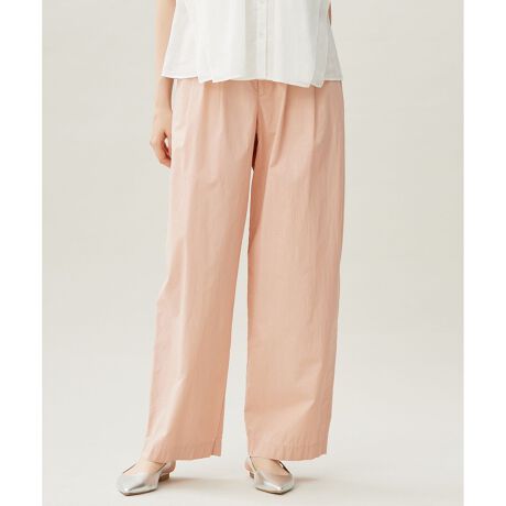 キレイめな素材をカジュアルにこなすタック入りパンツ■デザイン程よい肉感のシャツ地で仕立てた、タック入りのカジュアルパンツです。ほんの少しカーブするようなシルエットで、ワイドストレートとは違った今年らしいシルエットです。ウエストは横から後ろにかけてゴム入りなので着心地も快適です。綿のタイプライター素材に太番手のステッチを効かせることで、しわの似合うカジュアルな仕立てになっております。綿100%のさらりとしたタッチのキレイめな素材で、大人っぽいカジュアルスタイリングを楽しんで頂けるボトムです。■素材綿のタイプライター素材に特殊な加工を施すことで、表面の毛羽を抑えしなやかな風合いを出した素材です。タイプライターならではのハリ感を残しつつ程よくしなやかな風合いは、美しいシルエットを表現しながら体になじみます。薄すぎず厚すぎない肉感で暑い夏のボトムとしても心地よく着て頂ける素材感です。