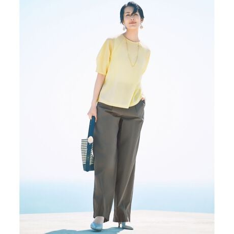 キレイめな素材をカジュアルにこなすタック入りパンツ■デザイン程よい肉感のシャツ地で仕立てた、タック入りのカジュアルパンツです。ほんの少しカーブするようなシルエットで、ワイドストレートとは違った今年らしいシルエットです。ウエストは横から後ろにかけてゴム入りなので着心地も快適です。綿のタイプライター素材に太番手のステッチを効かせることで、しわの似合うカジュアルな仕立てになっております。綿100%のさらりとしたタッチのキレイめな素材で、大人っぽいカジュアルスタイリングを楽しんで頂けるボトムです。■素材綿のタイプライター素材に特殊な加工を施すことで、表面の毛羽を抑えしなやかな風合いを出した素材です。タイプライターならではのハリ感を残しつつ程よくしなやかな風合いは、美しいシルエットを表現しながら体になじみます。薄すぎず厚すぎない肉感で暑い夏のボトムとしても心地よく着て頂ける素材感です。