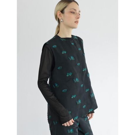 ジャガード織で浮き出された花柄が女性らしく、どこか華やかさを感じるノーカラージレ。ミニマムな印象ながらマットブラックに寒色で映える柄タッチがAgaこだわりの大人な逸品。幅広い身幅に短すぎない丈間が体型カバーに寄り添うアイテム。一着で洗練されたコーディネートを完成させ、幅広いレイヤードスタイルに華が咲きます。