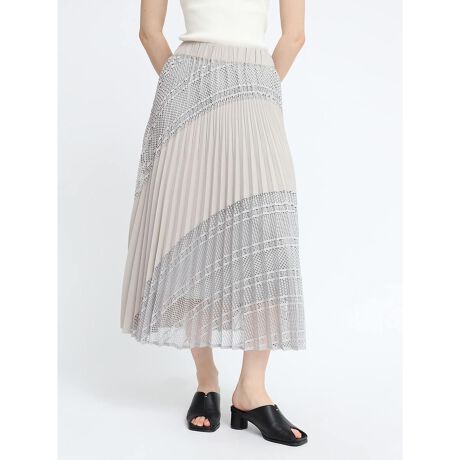 2つの表情を併せ持ったレースとのドッキングプリーツスカート。裾に向かって広がるプリーツ加工がリュクスライクな揺れ感を演出。一枚でコーデに華を持たせる大人のワードローブにもっていたい逸品。総ゴムタイプでリラクシーな履き心地を実現します。