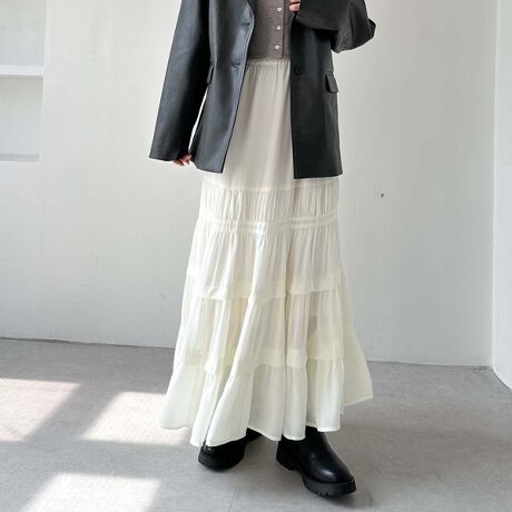 ほんのり透け感と落ち感があり、動くたびにふわっと揺れるティアードスカート。