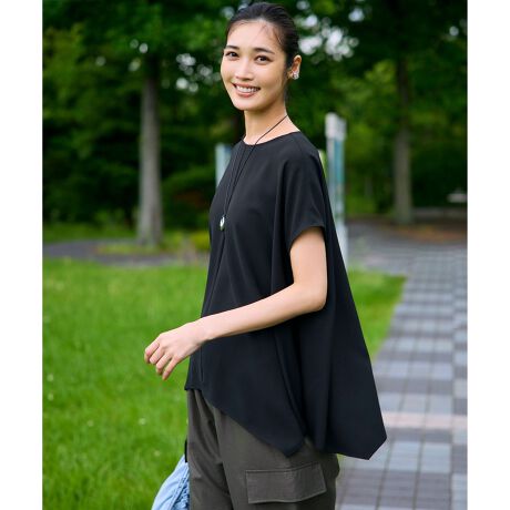 裾に向かって優雅に広がるフレアラインが魅力のプルオーバーです。重くなりがちなミドル丈を、イレギュラーヘム(アシンメトリーな裾)にすることで、リズミカルで軽やかな印象に。気になるヒップやお腹周りを自然にカバーしてくれるのも嬉しいポイントです。裾にデザイン性があるため、ネックラインはシンプルなクルーネックに仕上げました。一枚で着るだけでサマになり、パンツスタイルからスカートまで、様々なボトムスと相性抜群です。オフィスや華やぎの場所にも同素材のテーパードパンツやワイドパンツとのセットアップで大人っぽく着こなせ、カジュアルなワイドパンツに合わせてONにも着られます。カラーは、引き締まった印象のブラック(#005)、上品なネイビー(#075)、抜け感のあるダークブラウン(#035)の3色展開です。