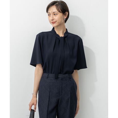 顔周りを華やかに彩るボウタイディテールが魅力のプルオーバーです。細幅のボウタイは、リボン結びにせず軽くひと結びするだけで、甘すぎない洗練された旬顔コーディネートが完成します。二の腕をさりげなくカバーする袖丈は、夏の終わりから秋の立ち上がりまで長くご着用いただけます。オフィスや華やぎの場所にも同素材のテーパードパンツやワイドパンツとのセットアップで大人っぽく着こなせ、カジュアルなワイドパンツに合わせてONにも着られます。カラーは、引き締まった印象のブラック(#005)、上品なネイビー(#075)、抜け感のあるダークブラウン(#035)の3色展開です。
