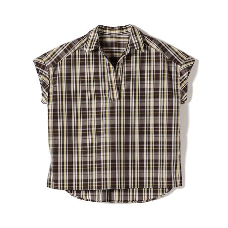 落ち着いたカラーのチェック柄が目を惹く、スキッパーブラウス。