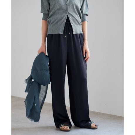 落ち感と光沢感が美しいサテン素材を使用した、リラックス感のあるワイドパンツ。