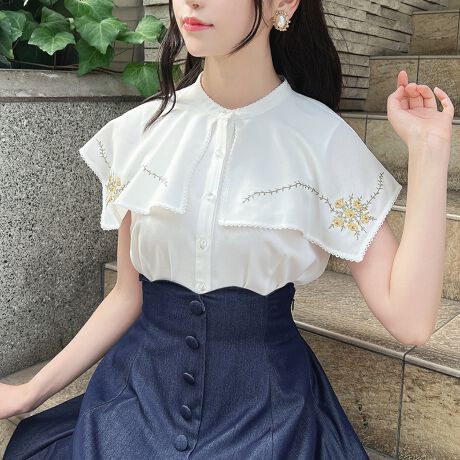 【洗える】スクエアケープ衿ローズ刺繍ブラウス