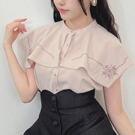 【洗える】スクエアケープ衿ローズ刺繍ブラウス