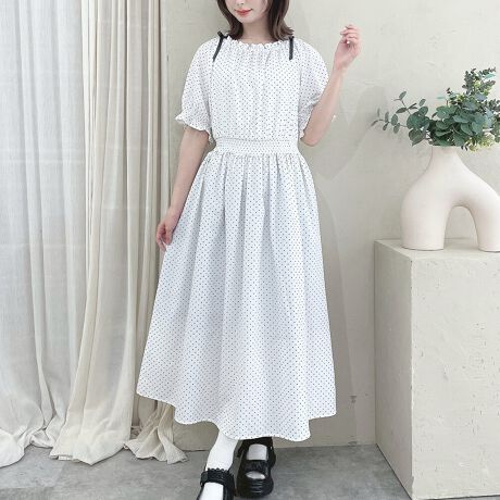 ショルダーのサテンリボンがポイントのドット柄ワンピース。