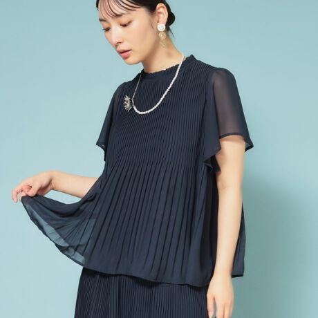 優雅に流れるプリーツが体型カバーにも効果的で、フレアスリーブが腕周りを華やかに、そしてさりげなくカバーし、上品な印象にみせてくれます。身頃裏付き。