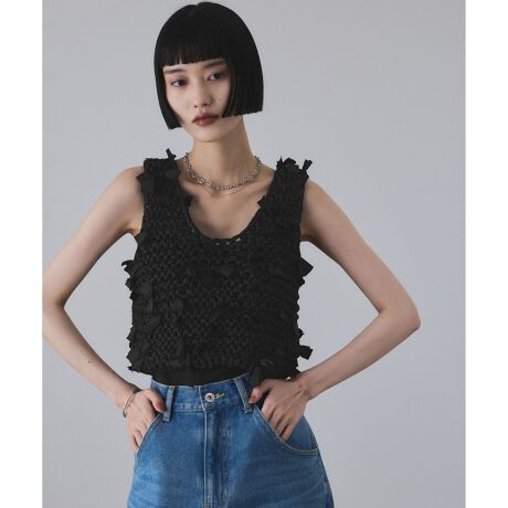 軽やかで柔らかな生地をテープ状にカットし、手編みで編み上げたノースリーブベスト。