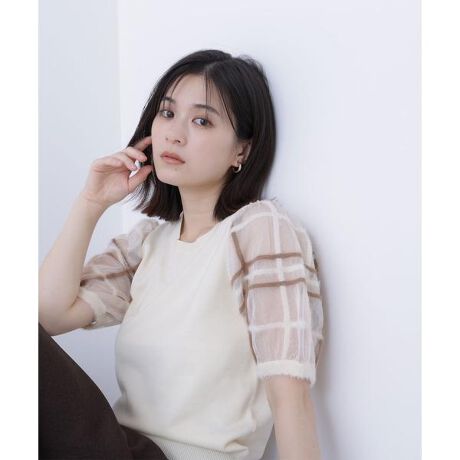 袖に配色とシアーチェック柄を効かせたニット。身頃はすっきりとした天竺編みで、シアーな袖はシャギー糸でチェック柄を組んだ晩夏らしいデザインです。ボリューム感のあるスリーブなので、ONにもOFFスタイルにもフェミニンな雰囲気で着ていただけます。<素材>身頃はハイゲージ天竺、袖はシアー地にシャギーのチェック柄を使用。<詳細>仕様・開閉なし裏地・なし透け感・なし / 光沢・なし / 伸縮性・あり生地の厚さ・普通※モデルの着用画像の場合、光の当たり具合により、実際の色味と異なって見えることがございます。色味は、商品単体の画像をご参照ください。