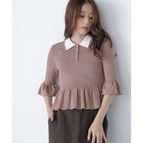 トレンドの配色が効いたダブルカラーのポロニット。ペプラムフリルがお腹まわりをカバーしながら華やかに見せてくれます。袖口にもフリルを入れてフェミニンさをプラス。コンパクトな丈感なのでスタイルアップを期待できます。合わせるボトムス次第でカジュアルにもキレイめにも着ていただけます。<素材>ドライタッチな伸縮性のあるリブ素材を使用しています。<詳細>仕様・前ボタン裏地・なし透け感・なし / 光沢・なし / 伸縮性・あり生地の厚さ・普通※モデルの着用画像の場合、光の当たり具合により、実際の色味と異なって見えることがございます。色味は、商品単体の画像をご参照ください。
