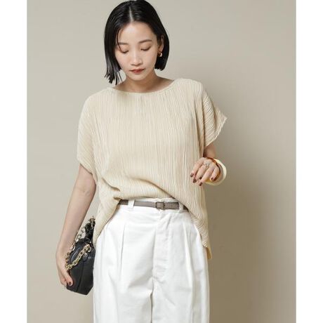 程良い光沢感と繊細なランダムプリーツが上品な印象のプリーツカットトップス。全面に施したプリーツ加工が動く度に軽やか揺れて、ON/OFFで華やかな雰囲気を演出してくれる着映えアイテムです。