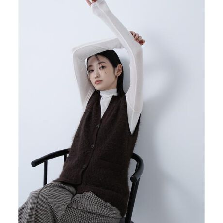 カフタン開きで首元に抜け感を作るボクシーベスト。暑い時期はノースリーブとして1枚着やTシャツと合わせたり、冬はニットやシアートップスと合わせれば、長く着ていただけます。ポケット付きデザインもポイント。厚手すぎない凹凸感のある編地なので暑苦しさを感じさせず、レイヤードに使いやすいデザインです。<素材>フェザー糸をメッシュ編みした編地を使用。メッシュから肌見えしすぎずささやかにラメ糸が光る表面感です。杢見えのグレーがおススメカラーです。<詳細>仕様・開閉なし裏地・なし透け感・なし / 光沢・ややあり / 伸縮性・あり生地の厚さ・普通※モデルの着用画像の場合、光の当たり具合により、実際の色味と異なって見えることがございます。色味は、商品単体の画像をご参照ください。